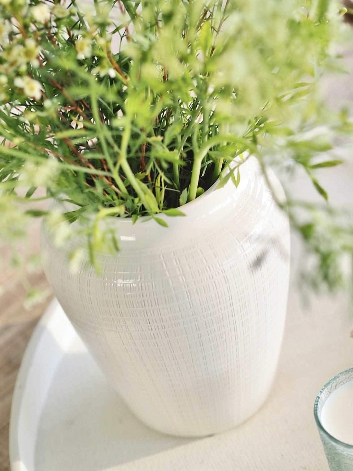Crafted by Bergs Pots, the Willow vase will make a great impression with its beautiful, bulky curves. Its woven pattern that is reminiscent of old wickerwork is accentuated by the deep glazed surface.