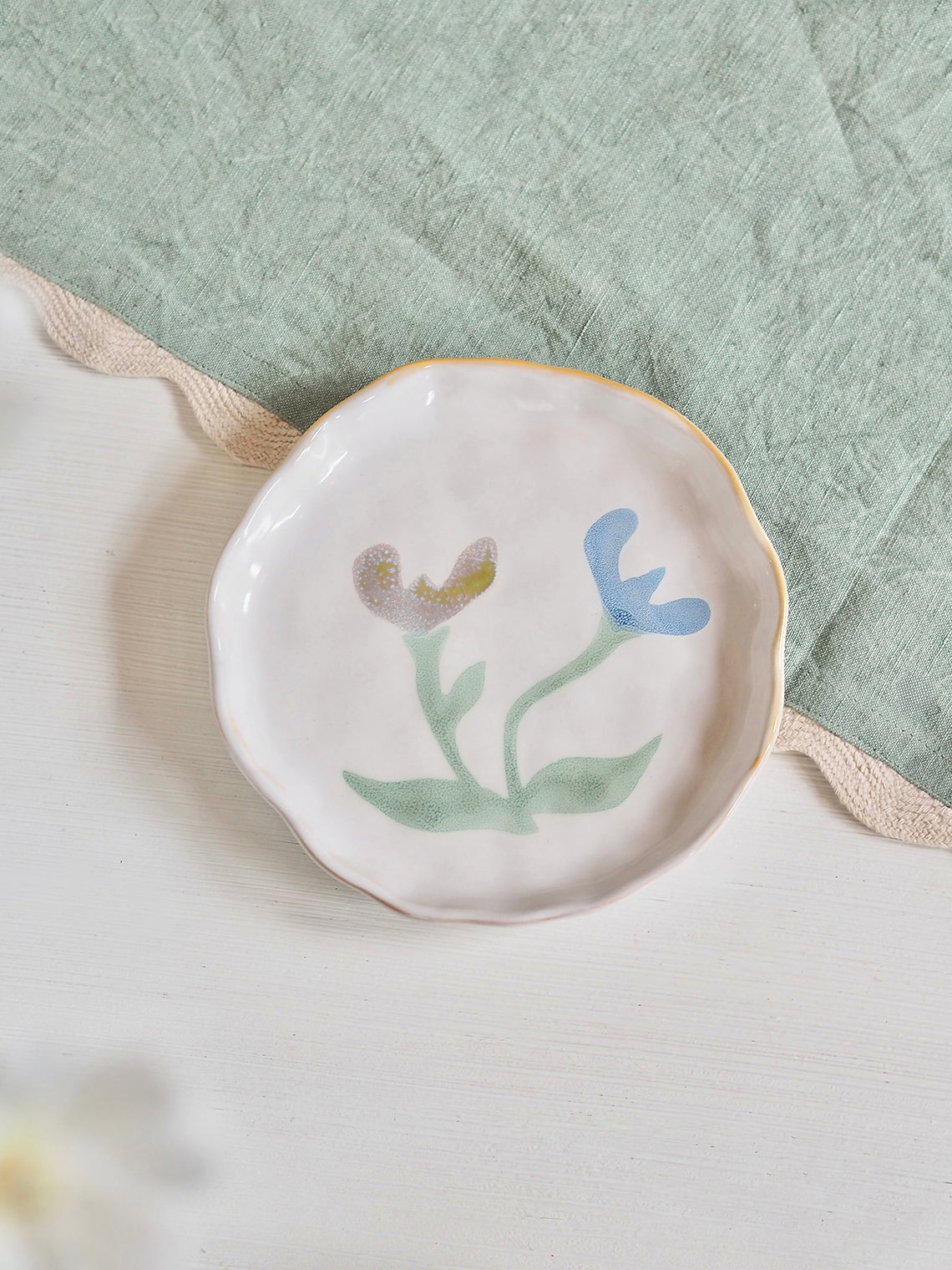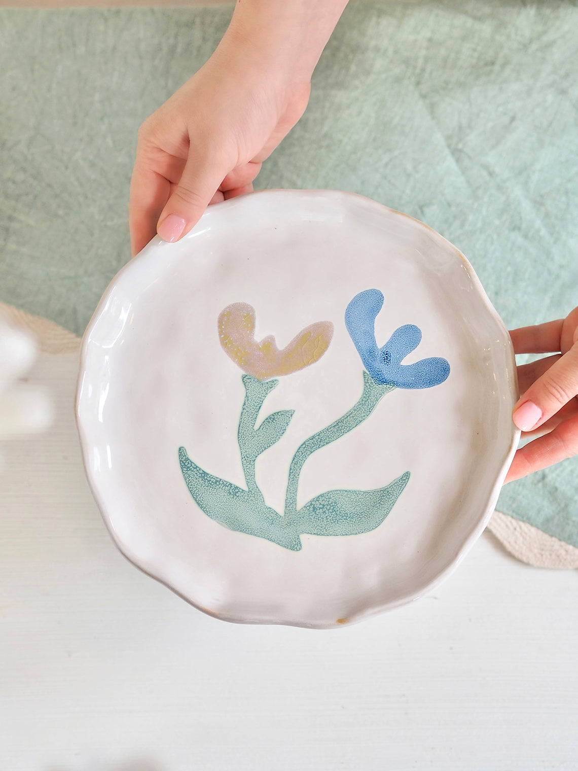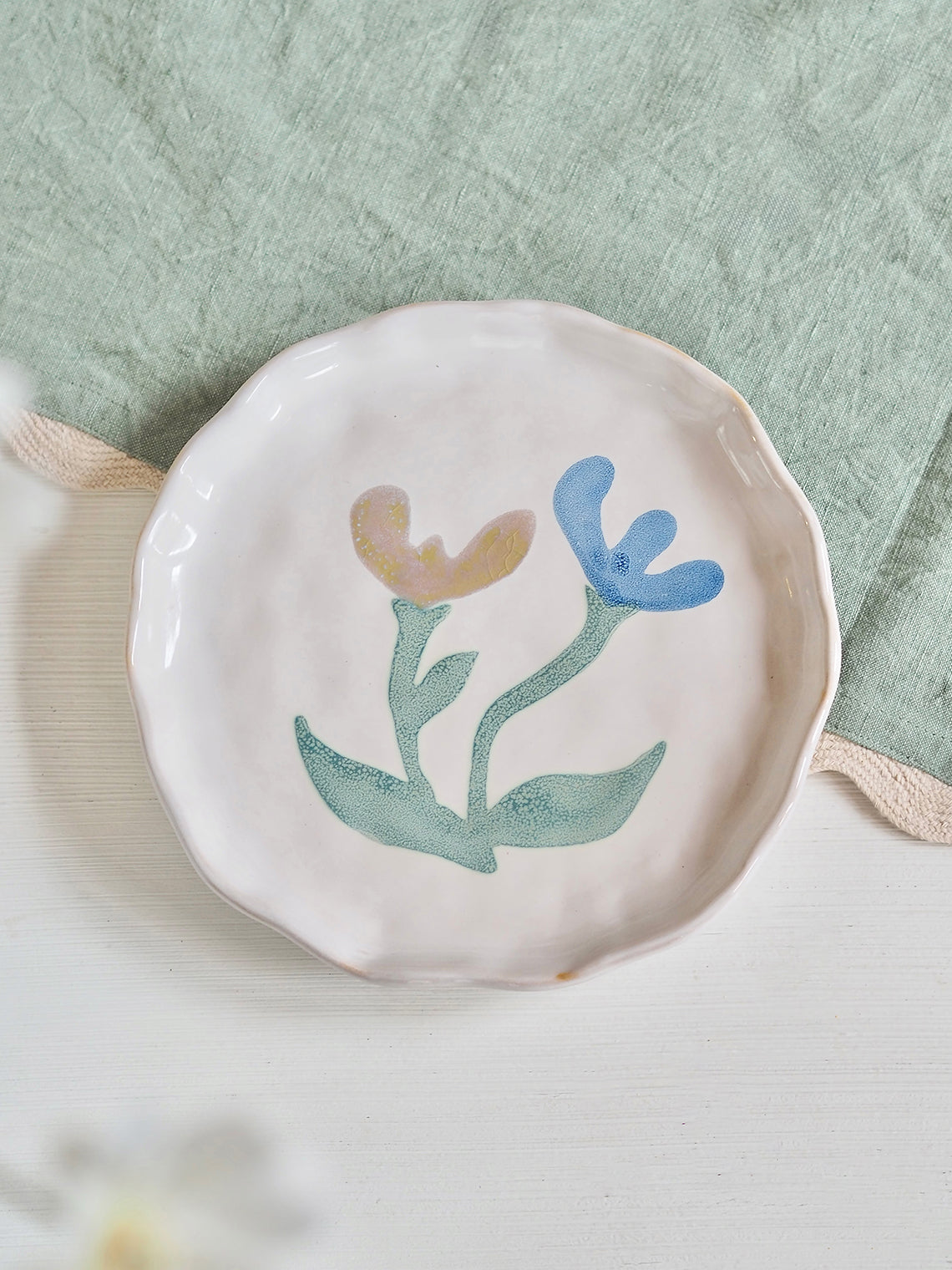 Bring a playful yet refined touch to your table with the Iris Painted Petals Plate. Crafted from 100% stoneware and finished in a gentle glossy glaze, this dinnerware piece features a hand-painted iris bloom that feels like a soft watercolour sketch. Its organic, hand-formed shape and warm ceramic tones peeking through add a charming cottage aesthetic. Whether used for dinners or displayed as wall art, this handcrafted product doubles as decor and function. It’s as practical as it is beautiful, build a collection and hang them together for an eclectic, curated display.