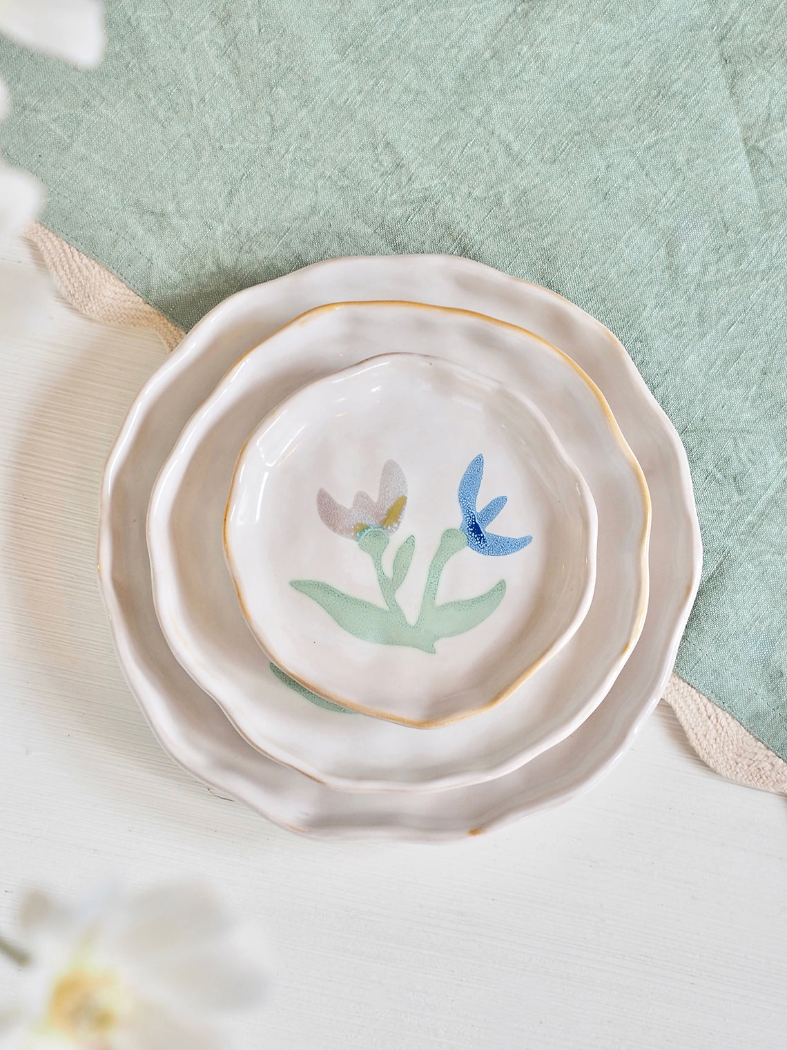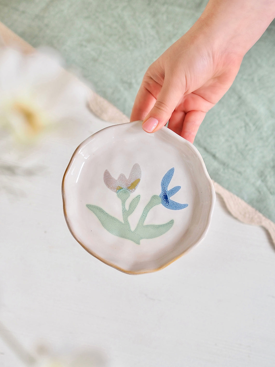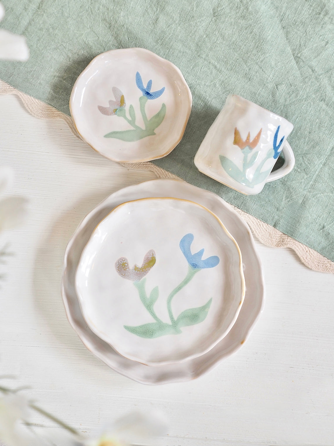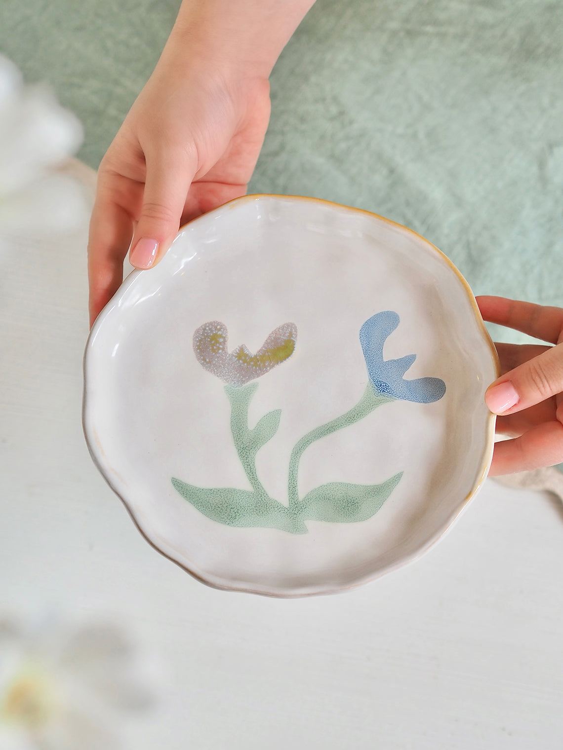 Bring a playful yet refined touch to your table with the Iris Painted Petals Plate. Crafted from 100% stoneware and finished in a gentle glossy glaze, this dinnerware piece features a hand-painted iris bloom that feels like a soft watercolour sketch. Its organic, hand-formed shape and warm ceramic tones peeking through add a charming cottage aesthetic. Whether used for dinners or displayed as wall art, this handcrafted product doubles as decor and function. It’s as practical as it is beautiful, build a collection and hang them together for an eclectic, curated display.